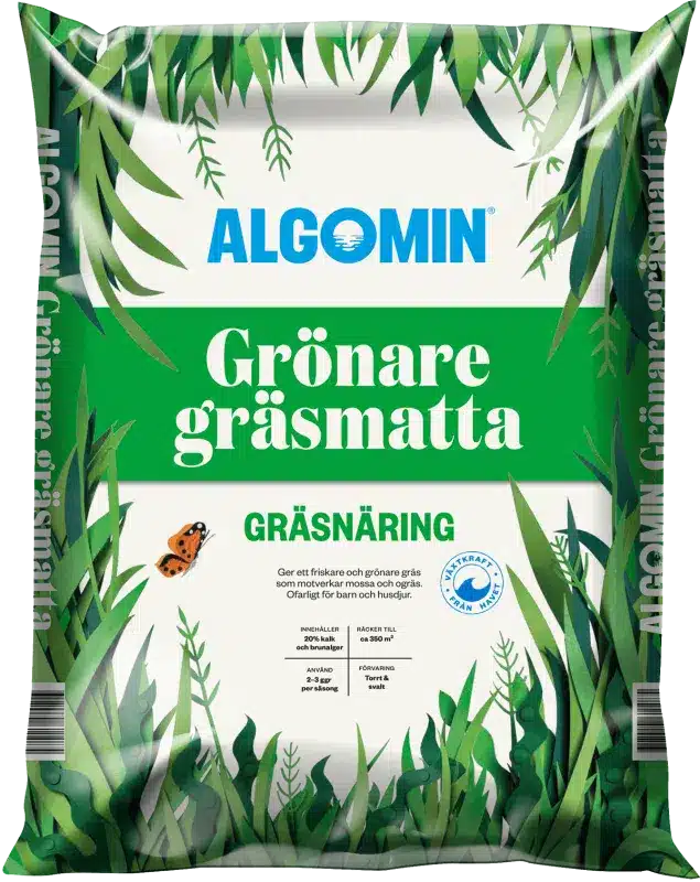 Algomin Grönare Gräsmatta är en kalkbaserad gödsel med tillsatser av brunalger samt långsamtverkande kväve och kalium. Den främjar både kvantitativ och kvalitativ tillväxt av gräset. Den unika blandningen med naturliga ämnen från brunalger gör växterna mer motståndskraftiga mot kyla, näringsbrist, vattenbrist och dålig jord. Algomin Grönare Gräsmatta ger extra kraft till allt grönt i din trädgård, och tack vare avsaknaden av lättlösliga näringsämnen finns ingen risk för brännskador på gräset.