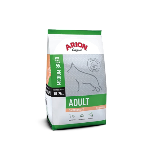 Arion Original Adult Medium Breed med lax & ris är ett glutenfritt foder framtaget för vuxna hundar av mellanstor ras. Adult Medium Breed är rik på lax och fiskolja för att säkerställa en optimal Omega 3 och 6 balans, tillsammans med adekvat zink och biotin som skapar en perfekt bas för en optimal päls och hud. Berikad med naturliga grön te extrakt och citrus som skydd för kroppens celler mot inflammation och skada från fria radikaler.