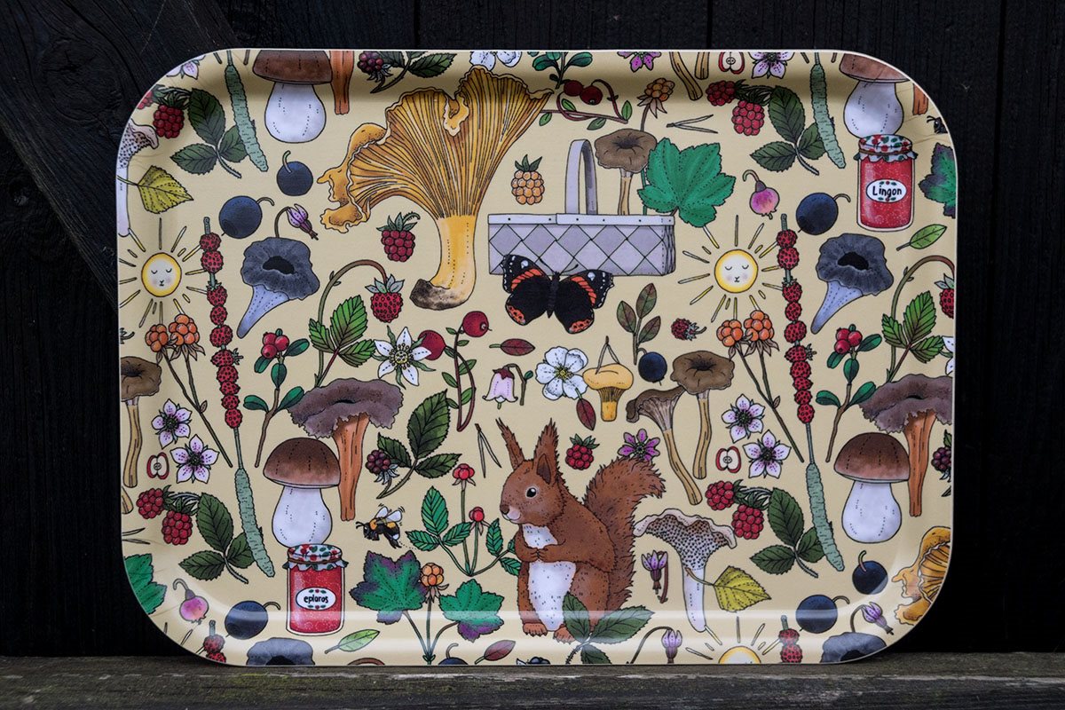 Bricka i björk med bär och svampar. Tillverkad i björk på Öland.