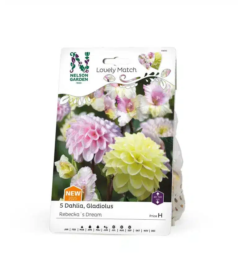 En ljuvlig kombination av en gladiol och två dahlior i harmoniska rosa nyanser som tillsammans bildar en perfekt bukett. Den är underbar både i kruka och rabatt. Plantorna blir mellan 80-120 cm i höjd.