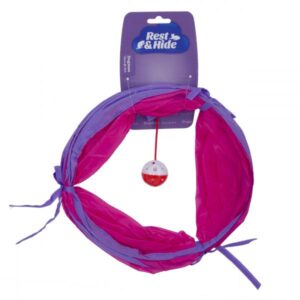 Hopfällbar lektunnel i spännande prassligt material. Fungerar både till katt och liten hund. Hopfällbar. Går att använda både inomhus och utomhus och är en perfekt plats för din katt att leka på eller gömma sig.