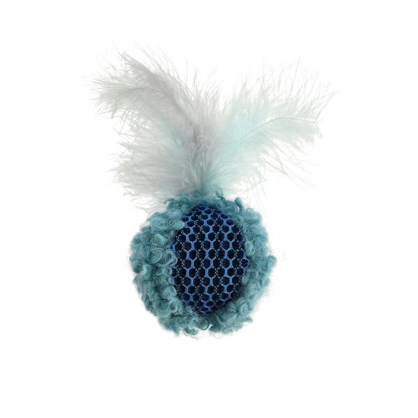 Boll av mesh- och lurvigt tyg. Fjäder på toppen. Innehåller kattmynta.