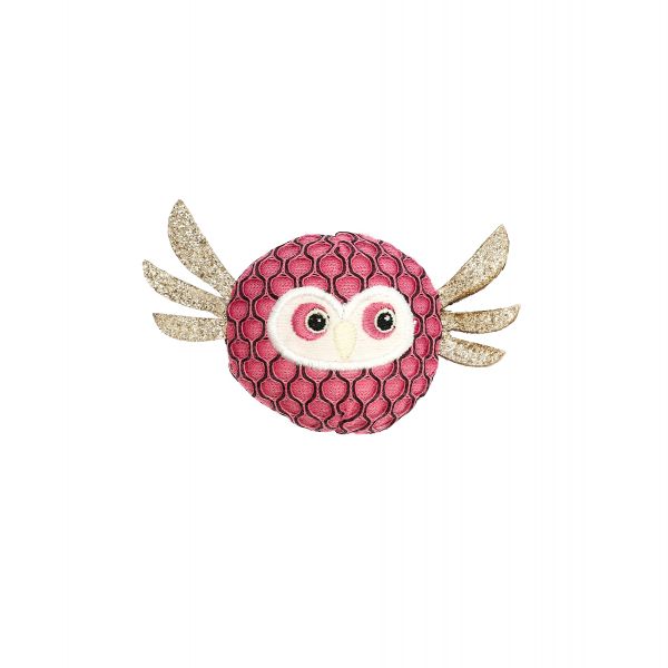 Söt, rosa, uggla av meshtyg. Läckra, guldfärgade och glittrande vingar. Leksaken innehåller kattmynta.