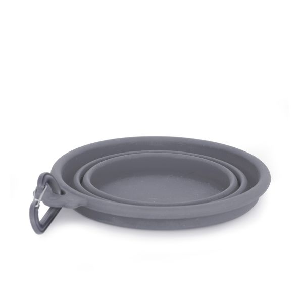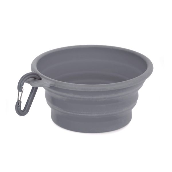 Hopfällbar skål av extra mjuk och följsam silikon. Perfekt att ta med på resan. Du fäster den enkelt på t.ex. kopplet eller byxorna med hjälp av den medföljande karbinhaken.