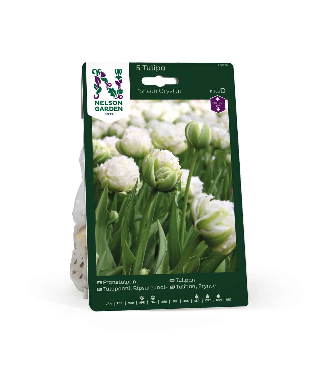 ’Snow Crystal’ är en vacker franstulpan med vita, lätt fransiga blomblad och stadiga stjälkar. Den är dekorativ i rabatter, grupper eller som snittblomma och sprider elegans i trädgården under våren.