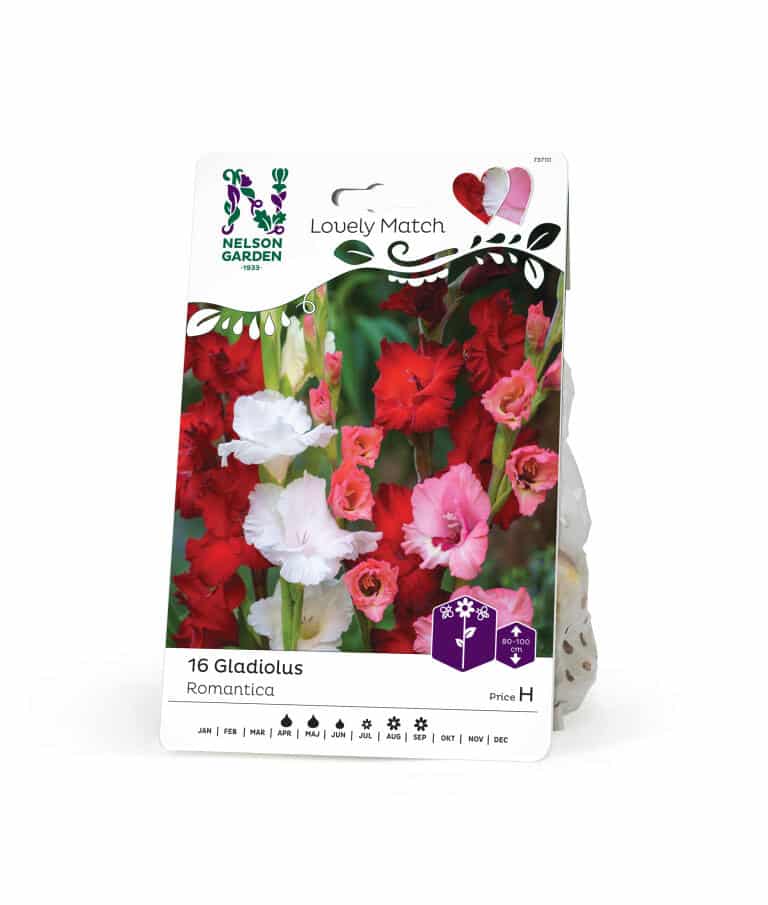 En fantastisk blandning av storblommiga gladioler i djupa, intensiva färger. Plantera dem i en rabatt eller stor kruka, och tveka inte att plocka dem för snitt så snart den nedersta blomman slår ut. Plantornas höjd blir 80-100 cm. En mäktigare bukett är svår att finna.