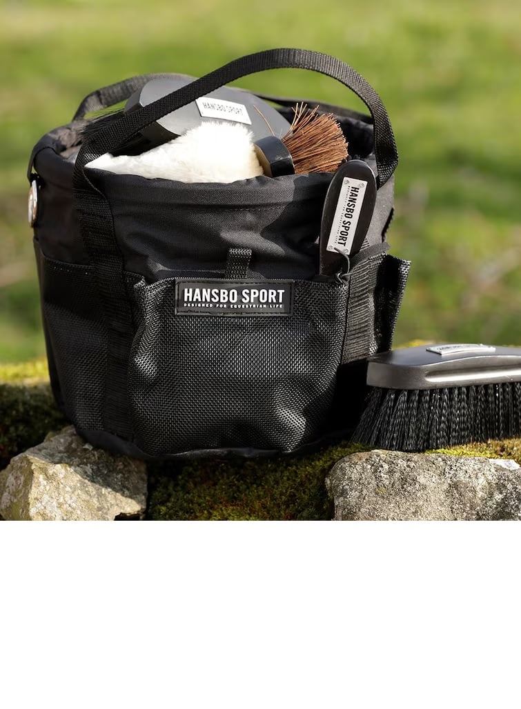 Groomingbag i kraftig vattenavvisande polyester. Praktiska fickor och fack för allt man kan tänkas behöva till hästen och sig själv. Försedd med en metallring för bibehållande av form, namnficka, kraftiga bärhandtag, dragskoförslutning upptill.