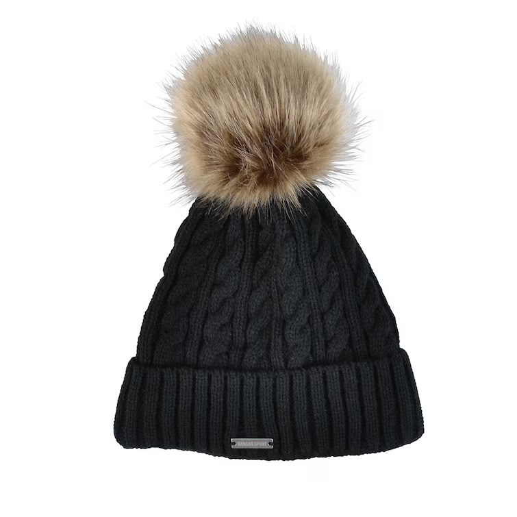 Grovstickad mössa med mysigt foder av fleece som håller dig varm och skön i stallet. Metallbricka med Hansbo Sport logga och klassisk fuskpälsboll.