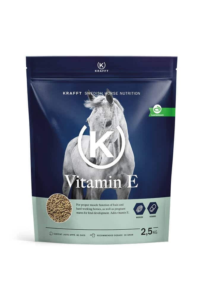 Vitamin E är viktig för störningsfri muskelfunktion hos t ex hårt arbetande hästar och föl. Även dräktiga ston kan behöva tillskott för fostrets vävnadstillväxt. Högkoncentrerad ren vitamin E, utan tillsats av selen.