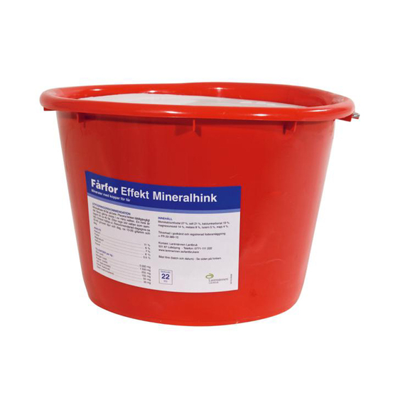 Effekt Mineralhink Får är ett mineralfoder till får för enkel utfodring på bete. För kopparkänsliga får rekommenderas Effekt Får Mineralhink utan koppar. Utfodringsrekommendation: Placera hinken lättillgängligt där djuren gärna vistas, t ex nära vatten. En hink är lagom till ca 40 får. Efter regn bör vatten som samlats i hinken hällas ut. Bör förbrukas. Förvaras torrt. Bör förbrukas inom 24 månader från tillverkningsdagen – se bäst före på förpackningen. Förpackningar: Effekt Mineralhink Får tillhandahålls i förpackning om 22 kg.