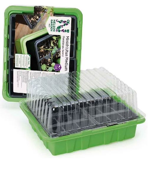 Minidrivhus från Nelson Garden inklusive 4 stycken krukinsatser med 6 celler. De djupa krukinsatserna ger plantorna de allra bästa förutsättningarna att utveckla fina rotsystem. Fördjupningarna i växthusets botten passar även till 20 torvbriketter. Drivhuset placeras med fördel på fönsterbrädan.