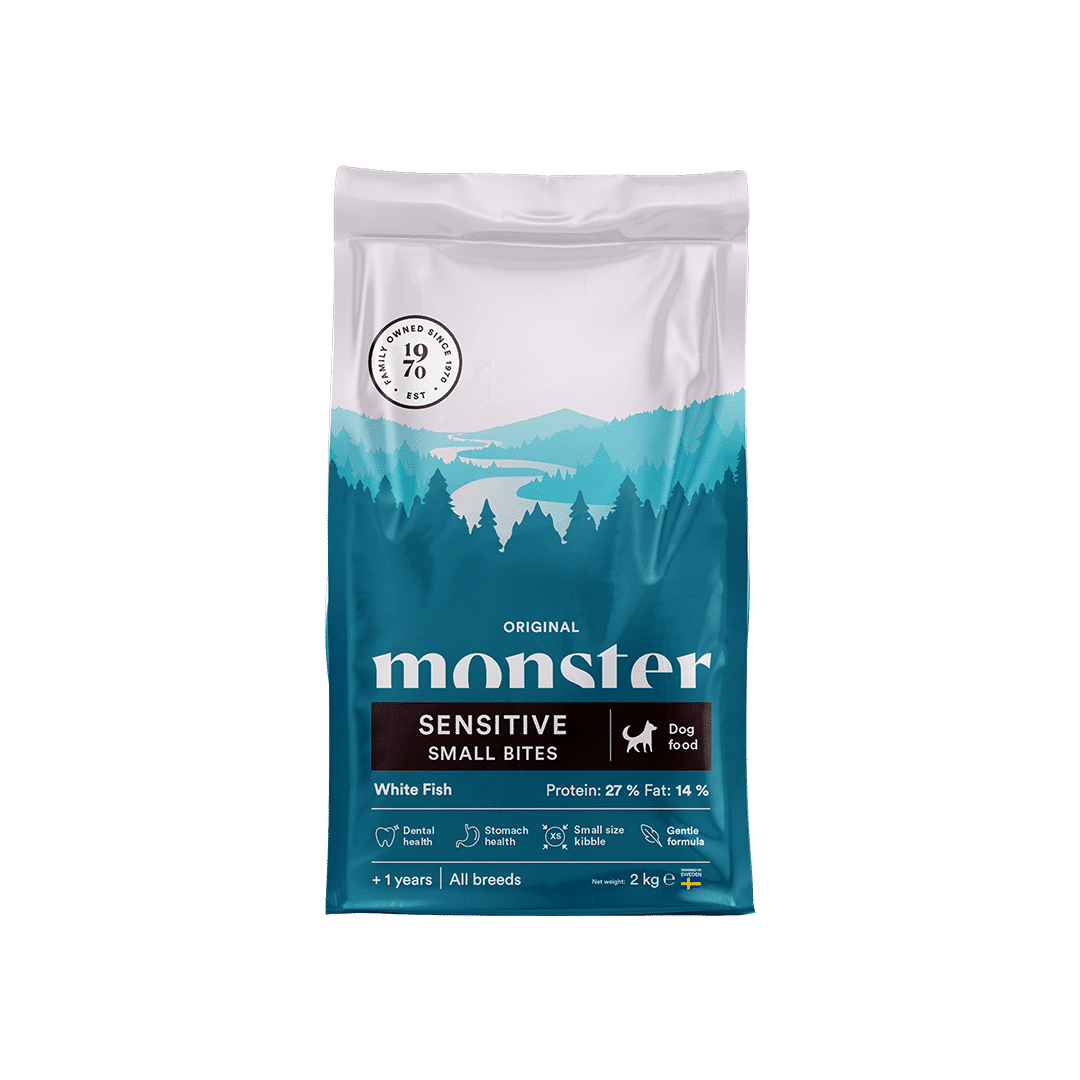 Trodde du att det var omöjligt att hitta ett hundfoder som passar både för känsliga hundar och har lagom små foderkulor? Tänk om! Med Monster är nästan allt möjligt! Varje ingrediens är noggrant utvald och sammansatt i ett skonsamt recept. Små bitar som kan göra en stor skillnad.