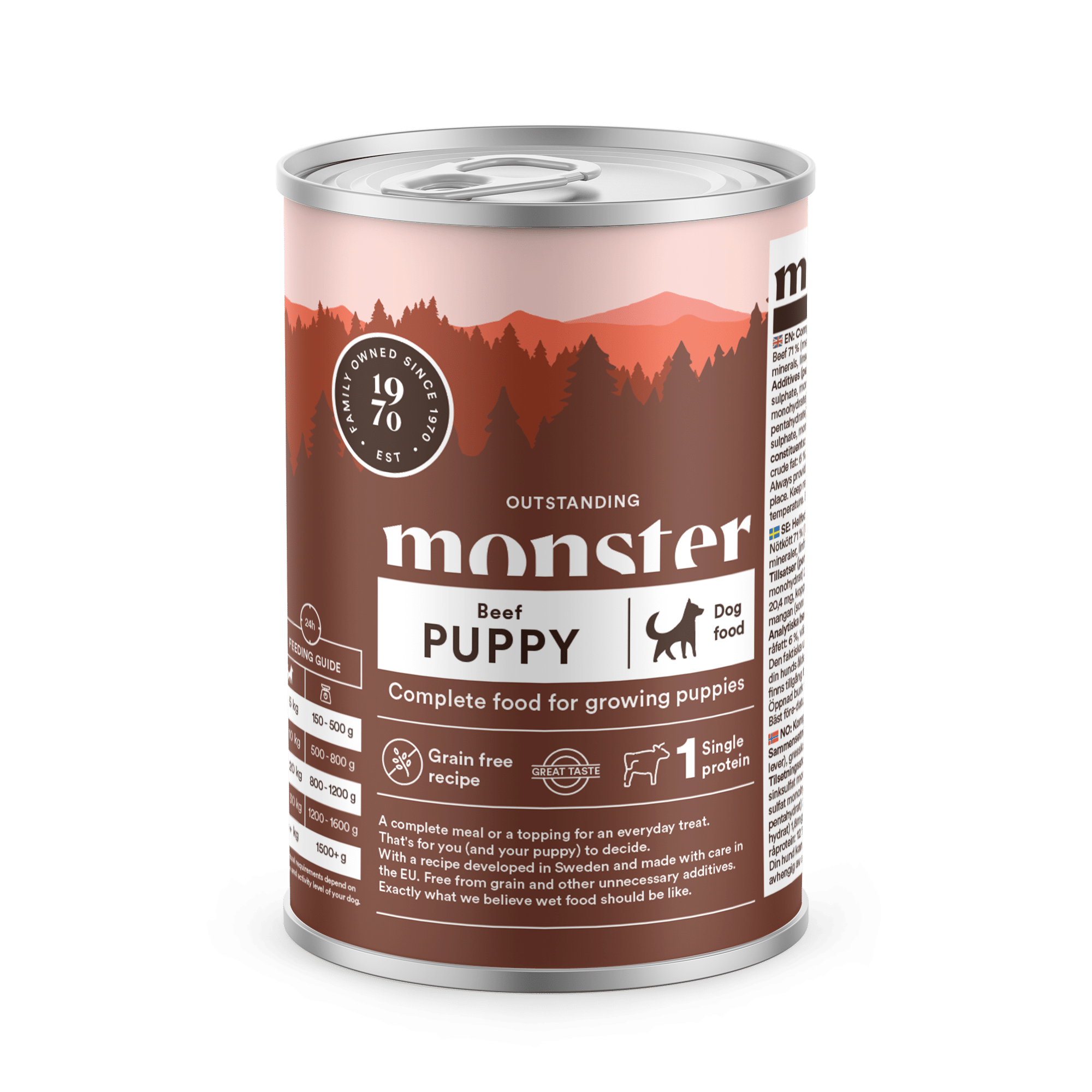 Smakligt nötkött som första ingrediens och enda proteinkällan. Komplett måltid eller bara lite guldkant på vardagen. Det bestämmer du (och din valp). Med recept framtaget i Sverige och omsorgsfullt tillagat i EU. Som är spannmålsfritt och utan andra onödiga tillsatser. Precis så som vi tycker att en blötmat ska vara.
