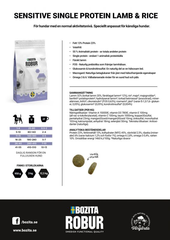 Bozita Robur Dog Adult Sensitive Single Protein Lamm & Ris – skonsamt torrfoder för känsliga hundar, tillverkat i Sverige