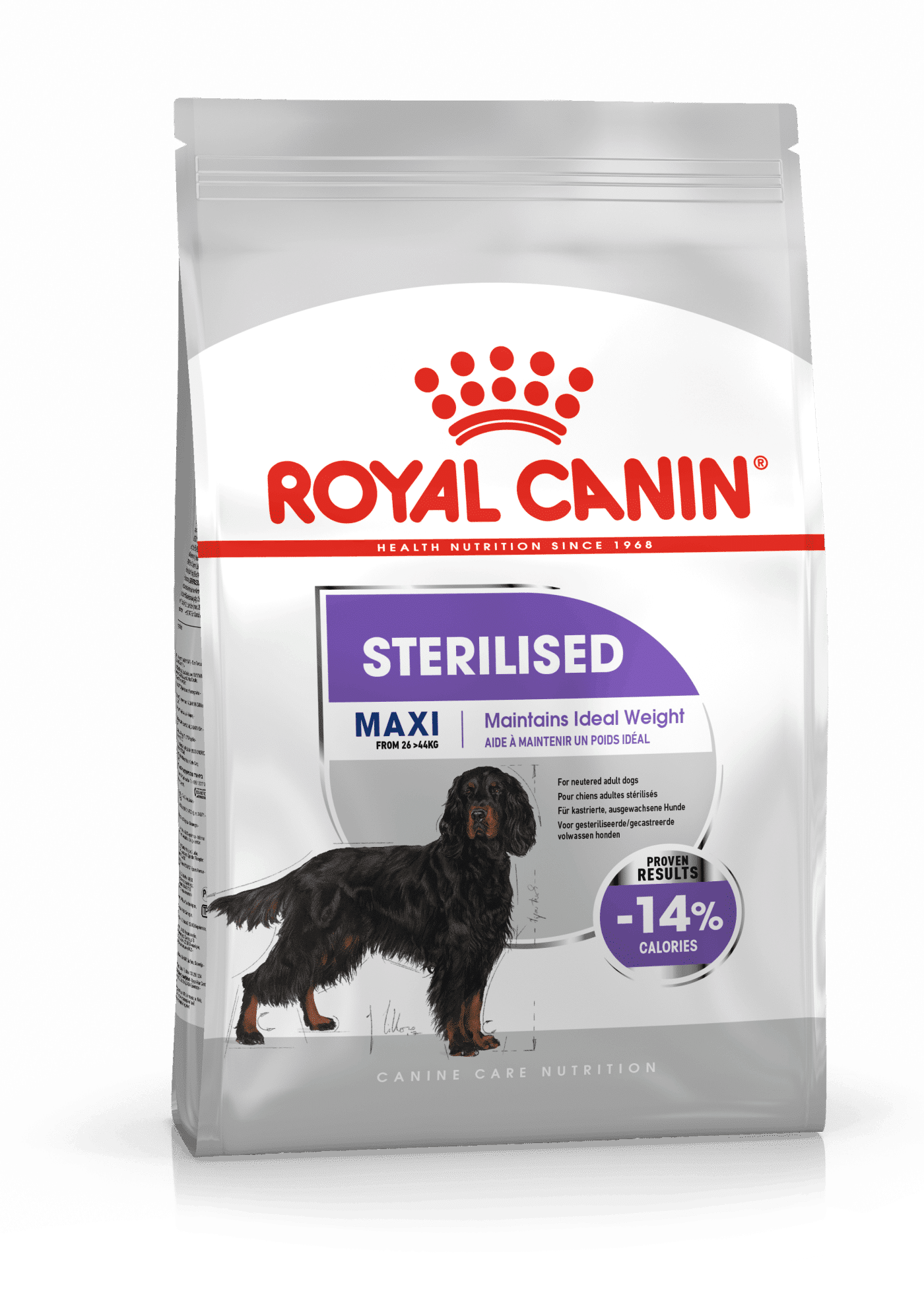 Efter kastrering blir din hunds ämnesomsättning ofta långsammare, men aptiten kan vara densamma som förut. Det kan vara en utmaning att se till att hunden bibehåller sin idealvikt, men ett högkvalitativt helfoder kan hjälpa din hund att hålla sig aktiv och i form. ROYAL CANIN® Sterilised Maxi välsmakande högkvalitativa helfoder tillfredsställer din hunds aptit – utan viktökningen. Fodret är lämpligt för kastrerade vuxna hundar som väger mellan 26 och 44 kg.Royal Canin förstår vikten av protein. Därför använder vi bara protein av högsta kvalitet, speciellt anpassade till din hunds exakta behov. ROYAL CANIN® Sterilised Maxi är rikt på proteiner med hög smältbarhet för att hjälpa din hund bibehålla sin muskelmassa, samtidigt som fett- och kaloriinnehållet är reducerat.Detta foder har utformats med en lägre fetthalt för att hjälpa din hund bibehålla en hälsosam vikt och undvika de hälsokomplikationer som följer med extra kilon.Kombinationen av kostfibrer i ROYAL CANIN® Sterilised Maxi tillfredsställer din hunds hungerkänsla, och genom att hjälpa din hund att behålla mättnadskänslan kan de också bidra till färre godbitar.Sterilised finns i två varianter; som knaprigt torrfoder och som läcker paté i en pouch (påse). Båda dessa varianter är näringsmässigt kompletta helfoder och kompletterar varandra perfekt. Varför inte prova patén som en läcker topping ovanpå torrfodret?