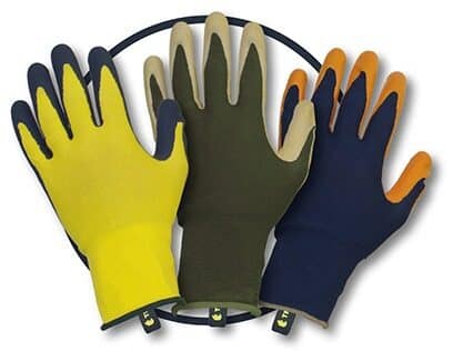 Vattentålig polyesterhandske, polyesterhandske med latexbeläggning och en mjuk nylonhandske med strukturbehandling.