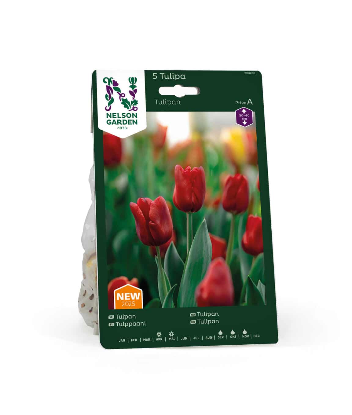 En elegant tulpan med djupt röda, relativt stora blommor på stadiga stjälkar. Blomformen är enkel och klassisk, och blommorna står länge, vilket gör sorten idealisk både i rabatter och som snittblomma. Perfekt för att skapa vackra buketter eller ge trädgården en färgstark vårkänsla.