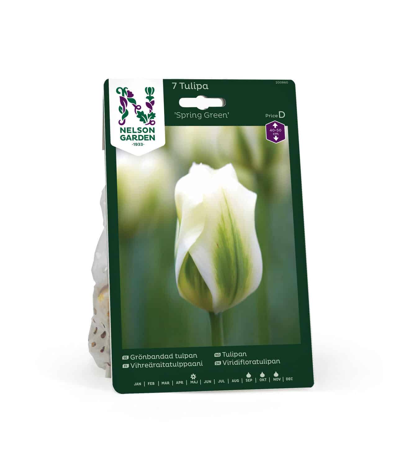 ’Spring Green’ är en elegant tulpan med stadiga stjälkar och vackra, benvita kronblad med gröna band. Den passar utmärkt i rabatter, grupper eller som snittblomma och ger trädgården ett fräscht vårinslag.
