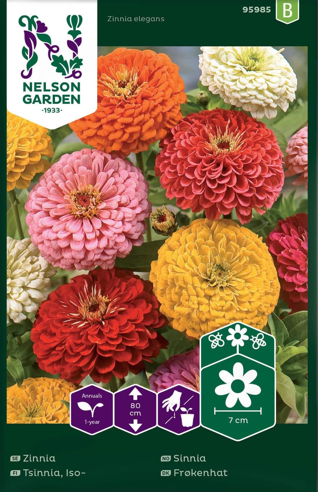Zinnia är en högväxt sommarblomma med vackra, rundade blommor i olika färger liknande dahlia. Dessa blommor växer på starka stjälkar och är utmärkta som snittblommor för arrangemang tack vare sin hållbarhet och enkelhet att kombinera med andra blommor. Plantan blir ungefär 80 cm hög och producerar flera blommor per stjälk om toppad. För att främja nya knoppar tas vissnade blommor bort. Zinnia kan antingen sås direkt på växtplatsen på våren eller förkultiveras inomhus för tidigare blomning. Den trivs i soliga lägen och väldränerad och näringsrik jord. Regelbunden vattning och näring under tillväxtsäsongen rekommenderas.